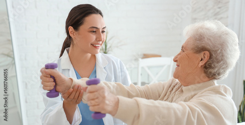 Fototapeta premium Physical therapist and senior woman training with dumbbells in bedroom