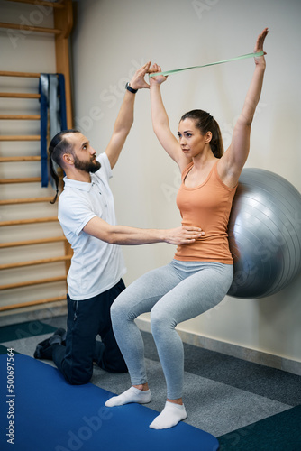 Fototapeta premium Physiotherapist assists sportswoman who is exercising with fitness ball and resistance band during physical therapy treatment.