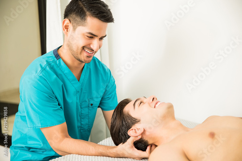 © AntonioDiaz, Obraz premium Physiotherapist Pressing Head Of Athlete In Clinic