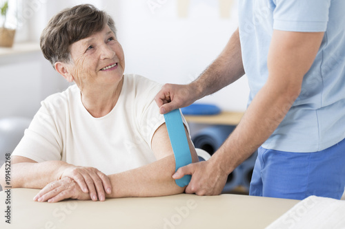 © Photographee.eu, Obraz premium Physiotherapist sticking kinesiotape to woman