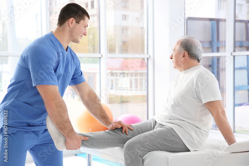 Fototapeta premium Physiotherapist working with elderly patient in clinic
