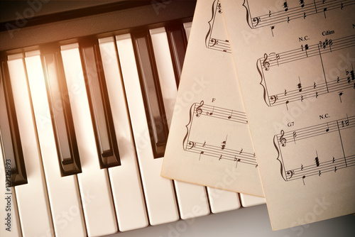 Obraz premium Piano keyboard with golden shine and sheet music top diagonal
