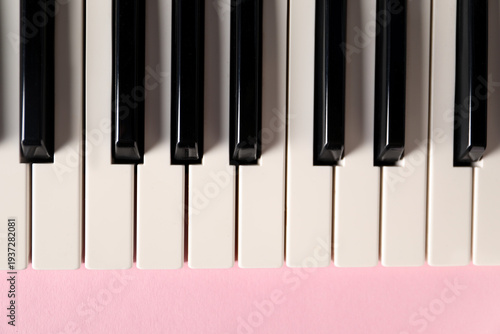 Naklejka premium Piano keys on pink background, top view. Musical instrument