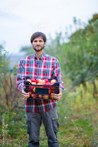 Fototapeta premium Picking apples. A man with a full basket of red apples in the garden.