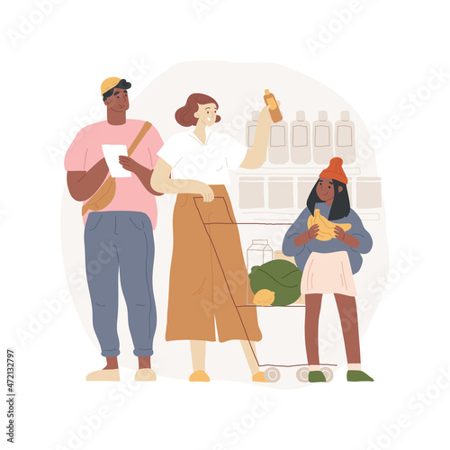 © Vector Juice, Naklejka premium Picking goods isolated cartoon vector illustration. Kid sitting in a cart, reaching out for goods, family lifestyle, picking grocery, shopping with children, help mom choosing cartoon vector.