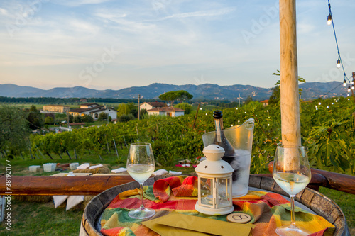 Fototapeta premium Picnic and wine tasting at sunset in the hills of Italy, Tuscany. Vineyards...