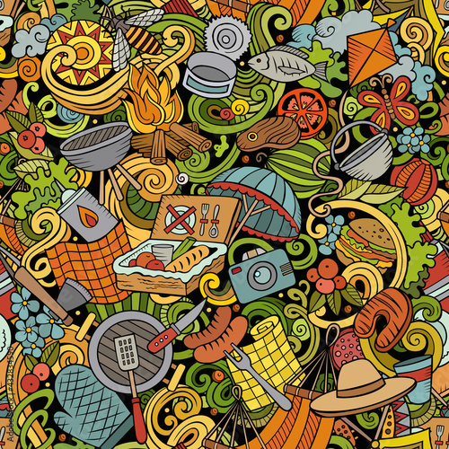 Obraz premium Picnic hand drawn doodles seamless pattern. BBQ background.