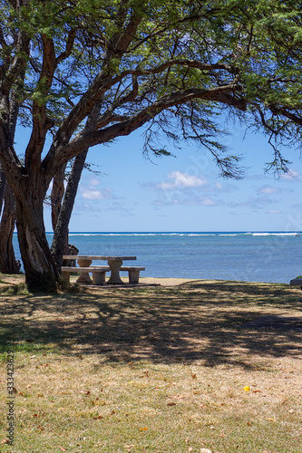 Fototapeta premium Picnic seat under tree overlooking ocean