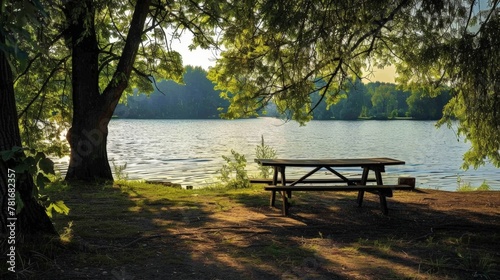 © The 2R Artificiality, Obraz premium Picnic table by lake shore