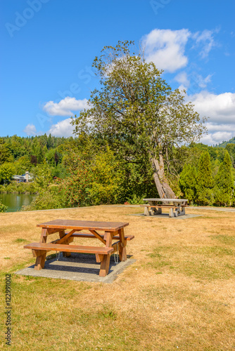 © karamysh, Obraz premium Picnic table over mountains and blue sky.