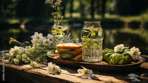 Fototapeta premium Picnic table set with different food and drinks with ham, fresh vegetables...