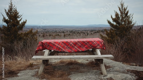 © Anat art, Obraz premium Picnic Table With Red Plaid Cloth Overlooking a Scenic Valley During Overcast Weather