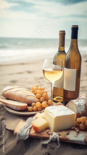 © Ilia, Naklejka premium Picnic with two wineglasses with white wine and bottle, bread, cheese, grapes on beautiful sea sand beach.