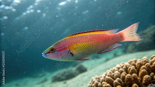 Naklejka premium Pictichromis paccagnellorum swimming in open water, Yellow and Red Stripes,...