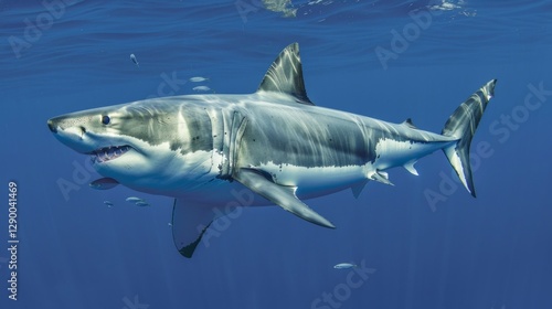 Fototapeta premium Picture a great white shark swimming powerfully through the deep blue ocean.