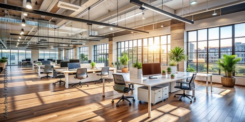 © Sirinporn, Fototapeta premium Picture a modern office layout with high ceilings - blured interior background for your presentation, copy space