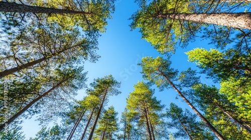 Obraz premium Picture a pine forest with a clear blue sky overhead.