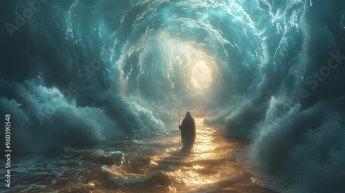 © Thuyet, Obraz premium Picture Moses leading the Israelites across the dry seabed, with his staff raised confidently, as the Red Sea forms massive waves on either side, the sky above filled with soft,