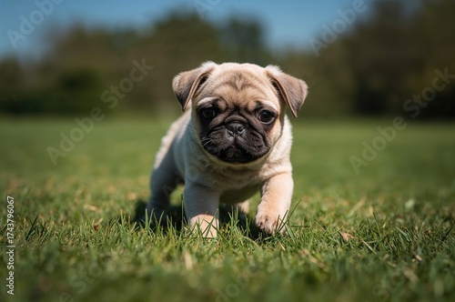 Fototapeta premium Picture of a small pug puppy frolicking outdoors under bright sunlight