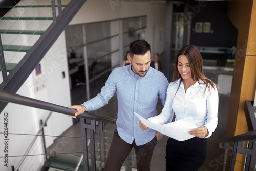 © NDABCREATIVITY, Fototapeta premium Picture of architects talking about project in hall