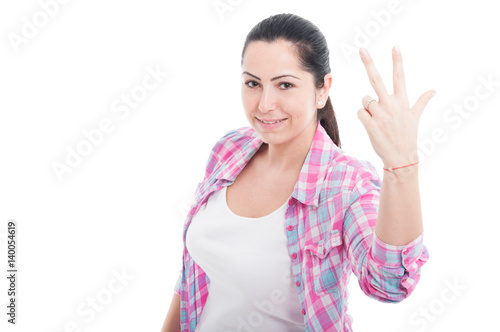 Fototapeta premium Picture of caucasian woman showing three fingers