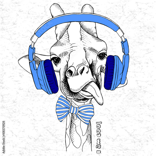 © Afishka, Fototapeta premium Picture of portrait of a giraffe in the headphones and bow. Vector illustration.