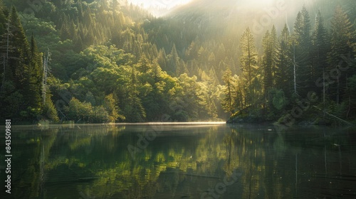 © chutikan, Obraz premium Picture of sunlight along the mountain and river