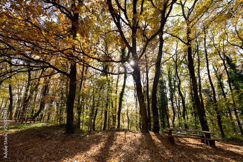 Fototapeta premium Picture of wooden bench in forest on sunlight