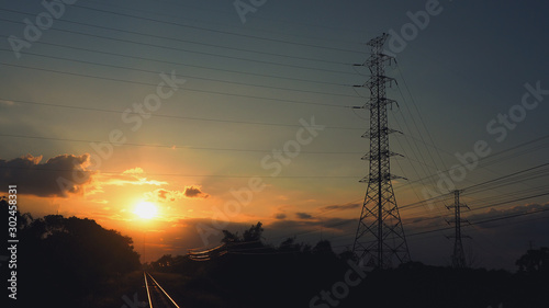 Fototapeta premium Pictures of electrical transportation through high voltage poles during sunrise time. Electric power transportation concept