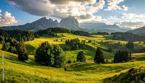 © Febifitri, Obraz premium Picturesque alpine valley bathed in sunlight