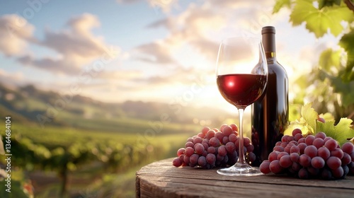 Obraz premium Picturesque and idyllic landscape of a lush vineyard at sunset with a bottle and glass of red wine in the foreground