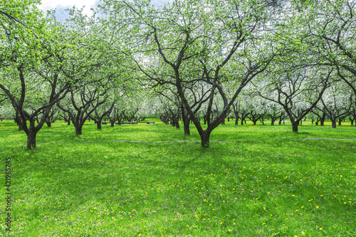 © Mr Twister, Obraz premium picturesque apple orchard at bright sunny day. spring garden landscape.