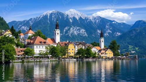 Fototapeta premium Picturesque Austrian Village with Scenic Mountain and Lake Reflection :...