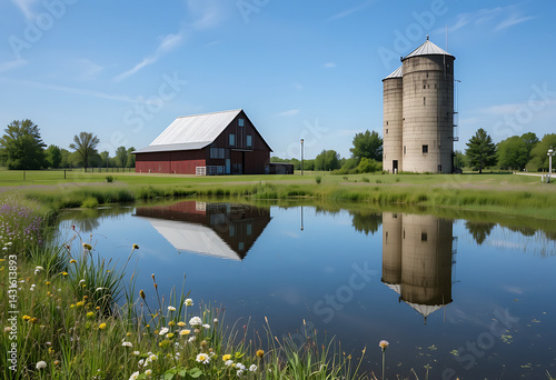 © skdesign, Obraz premium Picturesque barn and silo reflecting in tranquil pond under a clear blue sky