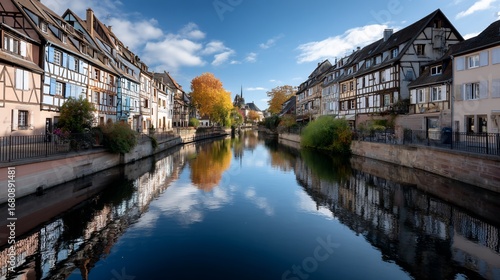Obraz premium Picturesque canal in a historic European city, autumn colors reflected in water. Charming buildings line the waterway, with a beautiful, mirrored reflection