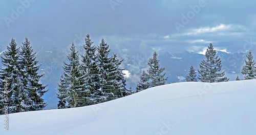 Fototapeta premium Picturesque canopies of alpine trees in a typical winter atmosphere after the winter snowfall above the tourist resorts of Valbella and Lenzerheide in the Swiss Alps - Canton of Grisons, Switzerland