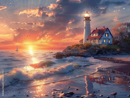 © Nawarit, Obraz premium Picturesque coastal village at sunset, with quaint cottages, a lighthouse, and waves gently lapping against the shore, creating a serene atmosphere
