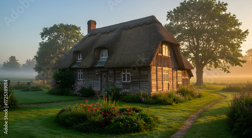 © Ifra, Obraz premium Picturesque Cottage with Thatched Roof in a Serene Setting