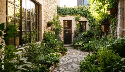 Fototapeta premium Picturesque courtyard garden, stone wall, door background, for travel article