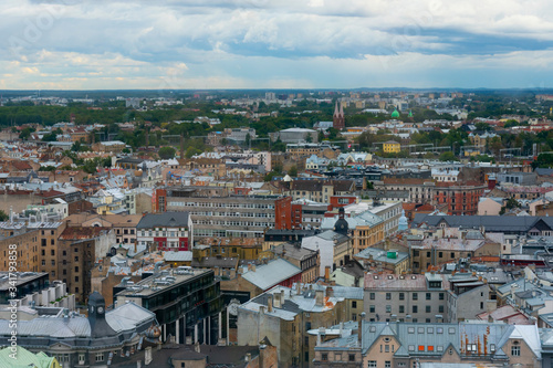 © Sunny_Smile, Obraz premium Picturesque detailed bird's eye view on tiny colorful houses of capital of Latvia, Riga in rainy day. Vacation in europian cities.