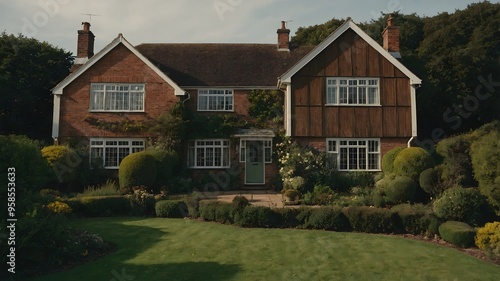© Oleksandr, Obraz premium Picturesque english dining room featuring a classic wooden table and elegant curtains