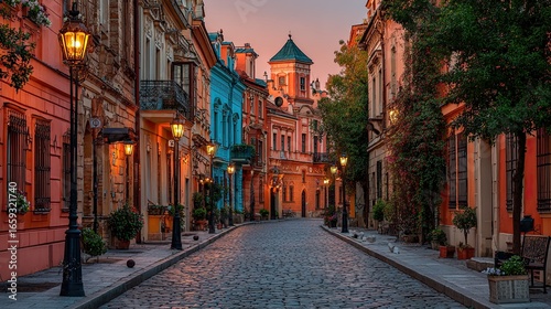 Fototapeta premium Picturesque European City Street at Dawn with Cobblestone Paths and Lush...