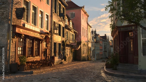 Fototapeta premium Picturesque European street scene bathed in warm sunlight showcases classic...