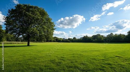 © Generative AI, Obraz premium Picturesque Green Lawn Under Bright Blue Sky with Fluffy Clouds : Generative AI