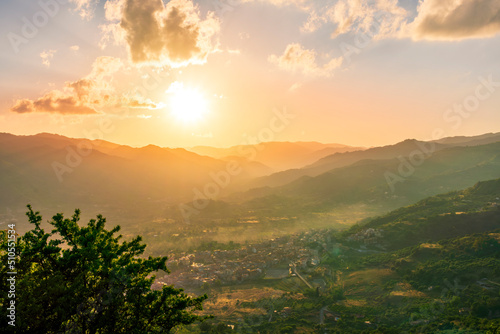 © Yaroslav, Obraz premium picturesque highland landscape with amazing view from mountain with green branches and leaves on sides