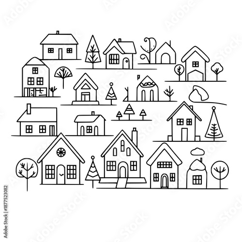 © AI04, Fototapeta premium Picturesque holiday village line art | Clean, isolated vector art for creative projects.
