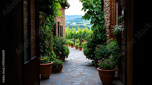 Naklejka premium Picturesque Italian Alleyway with Vibrant Greenery and Rolling Hills