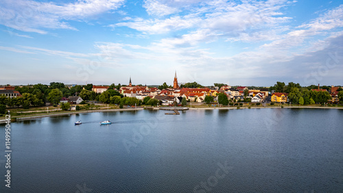 © KRASICKI Stanisław, Obraz premium Picturesque Lake Raduń in Wałcz, Poland. Tranquil waters of Lake Raduń with colorful town buildings, scenic promenade, and boats gliding on the surface in Wałcz, Poland.