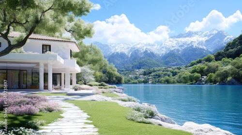 Fototapeta premium Picturesque lakefront home with stunning mountain views. Modern villa nestled beside a serene lake, surrounded by lush greenery, and majestic mountains in the background. \