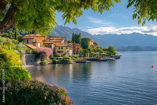 Naklejka premium Picturesque Lakefront Village with Mountains and Boats in the Background